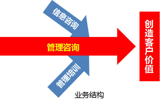 公司的业务结构是:信息咨询+管理培训+管理咨询。即以管理咨询为主体、以信息和培训为两翼的 “一体两翼”模式。
